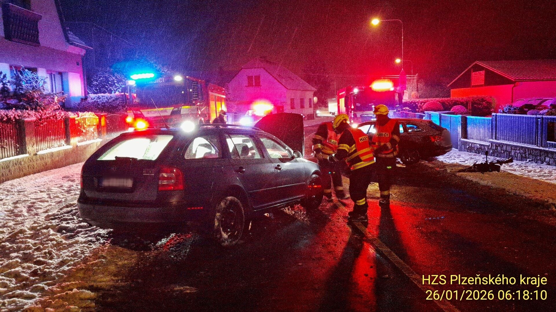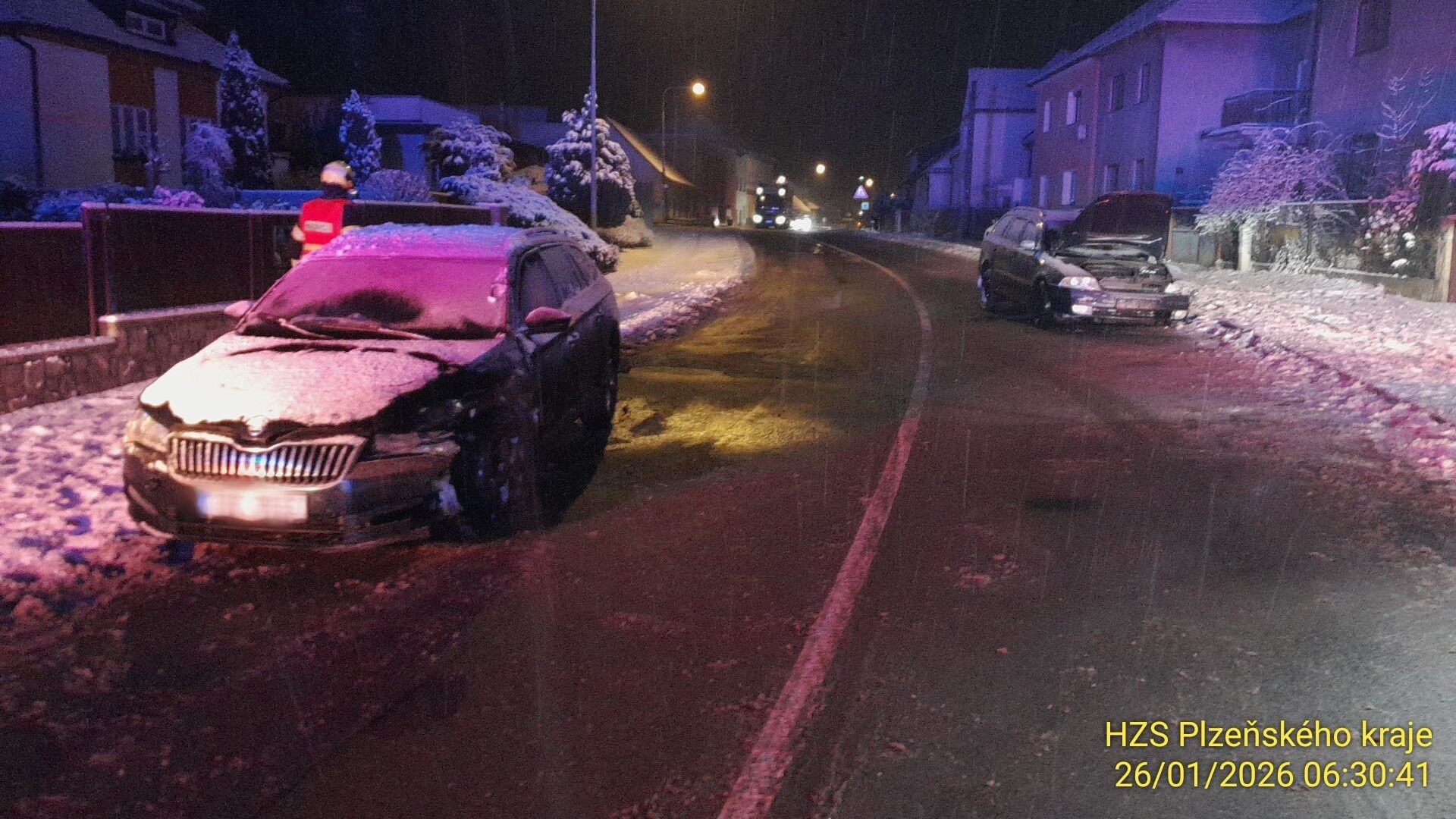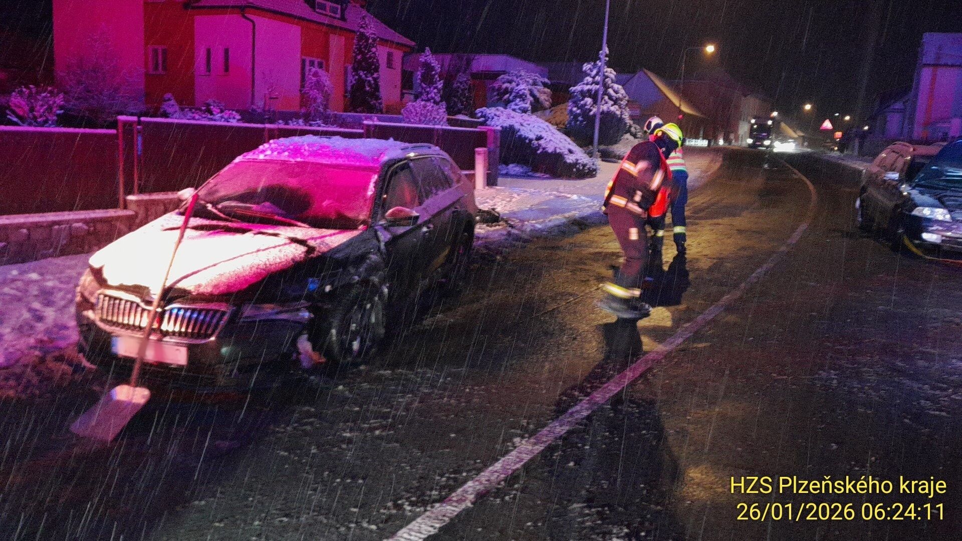 Západní Čechy zasáhlo očekávané intenzivní sněžení a mráz, které od nedělního večera komplikují situaci na silnicích. Plzeňští hasiči a záchranáři mají za sebou noc plnou výjezdů. Bourá se i dnes.