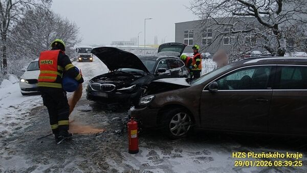 Před půl osmou vyjížděly složky k IZS k nehodě do plzeňského Božkova, dvě osobní vozidla se střetla v ulici K Hrádku.