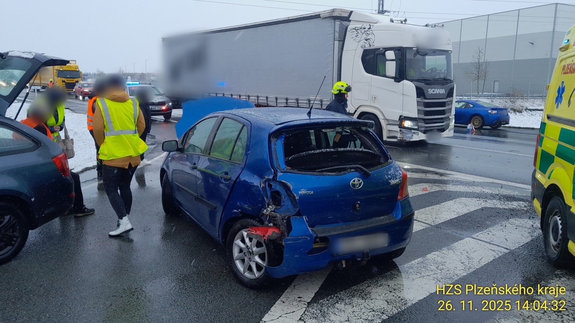 Hasiči na místě řídili dopravu. „Jedna zraněná osoba z osobního automobilu je v péči zdravotnické záchranné služby. Provedli jsme protipožární opatření,“ uvedl mluvčí hasičů Michal Holeček.