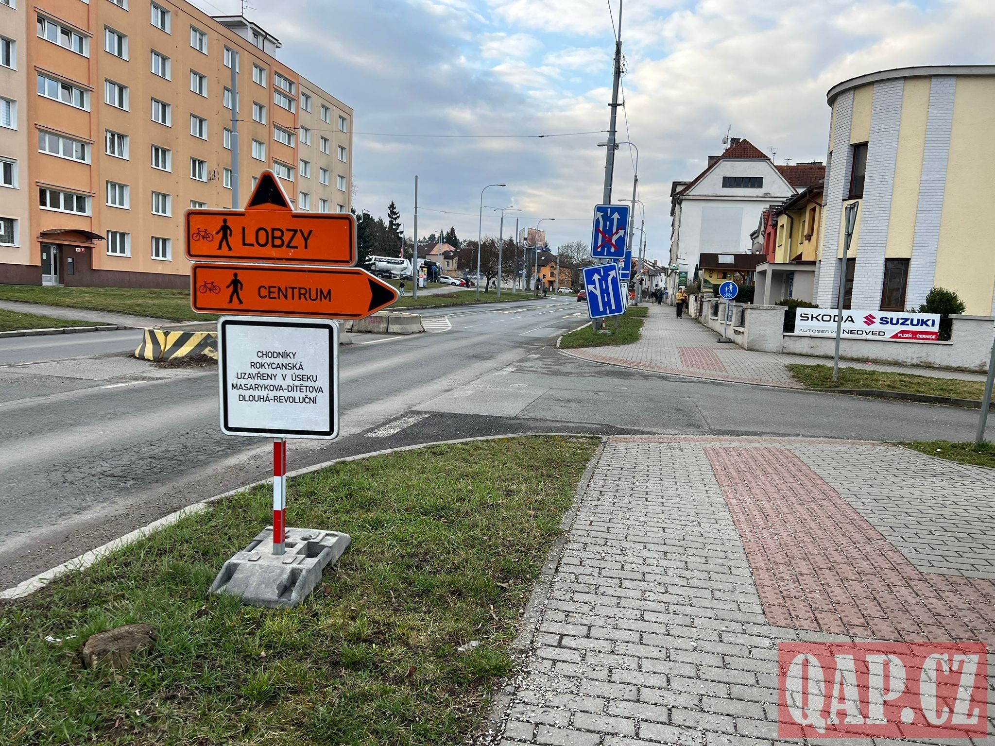 Stavební práce omezují také chodce. Je uzavřená společná stezka pro chodce a cyklisty v ulici Rokycanská v úseku mezi ulicí Revoluční a Dlouhá a chodníky podél staveniště. Náhradní trasa pro chodce a cyklisty je vyznačena shodně jako jednosměrný okruh, ve směru z centra ulicí Revoluční, Dlouhá, Masarykova a Partyzánská.