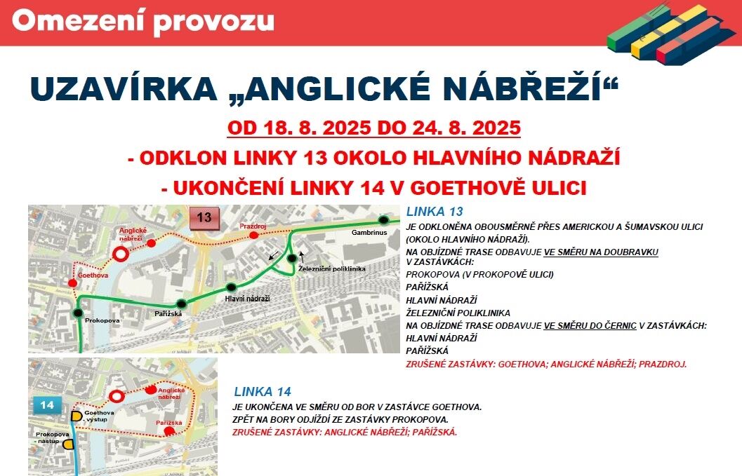 Z důvodu havárie na kanalizačním řadu na Anglickém nábřeží v Plzni dojde od pondělí 18. srpna do 24. srpna k odklonu trolejbusové linky 13 okolo Hlavního nádraží a k ukončení linky 14 v Goethově ulici.