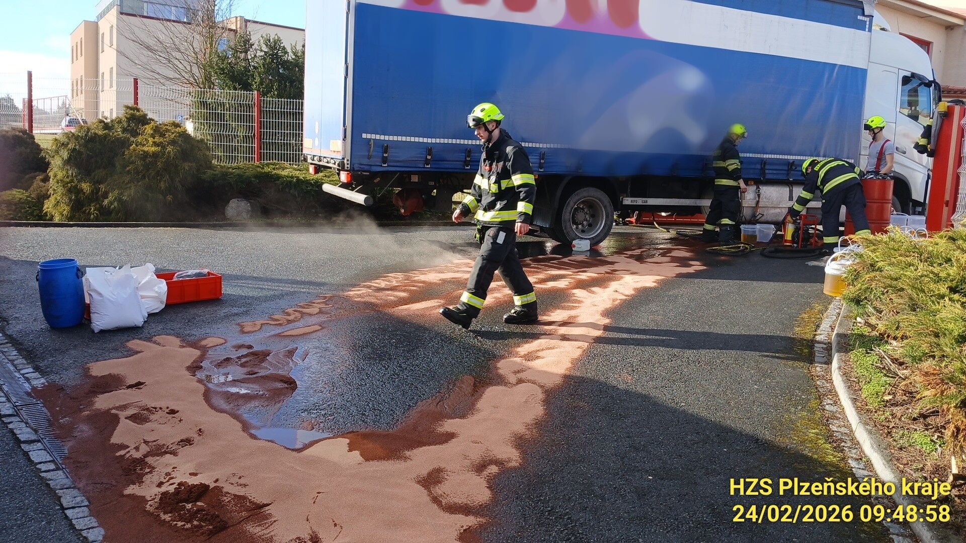 Hasiči byli k události vysláni krátce po deváté hodině ranní. Po příjezdu na místo zjistili, že z poškozených nádrží kamionu uniklo na silnici značné množství nafty, kterou bylo nutné okamžitě zajistit, aby nedošlo k ekologické havárii nebo znečištění kanalizace.
