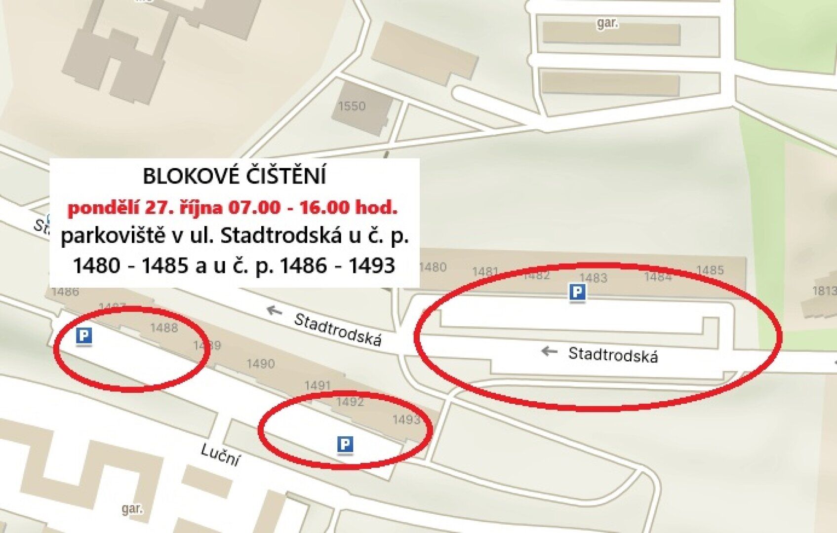 - Parkoviště v ulici Stadtrodská u č. p. 1480 - 1485 a u č. p. 1486 – 1493