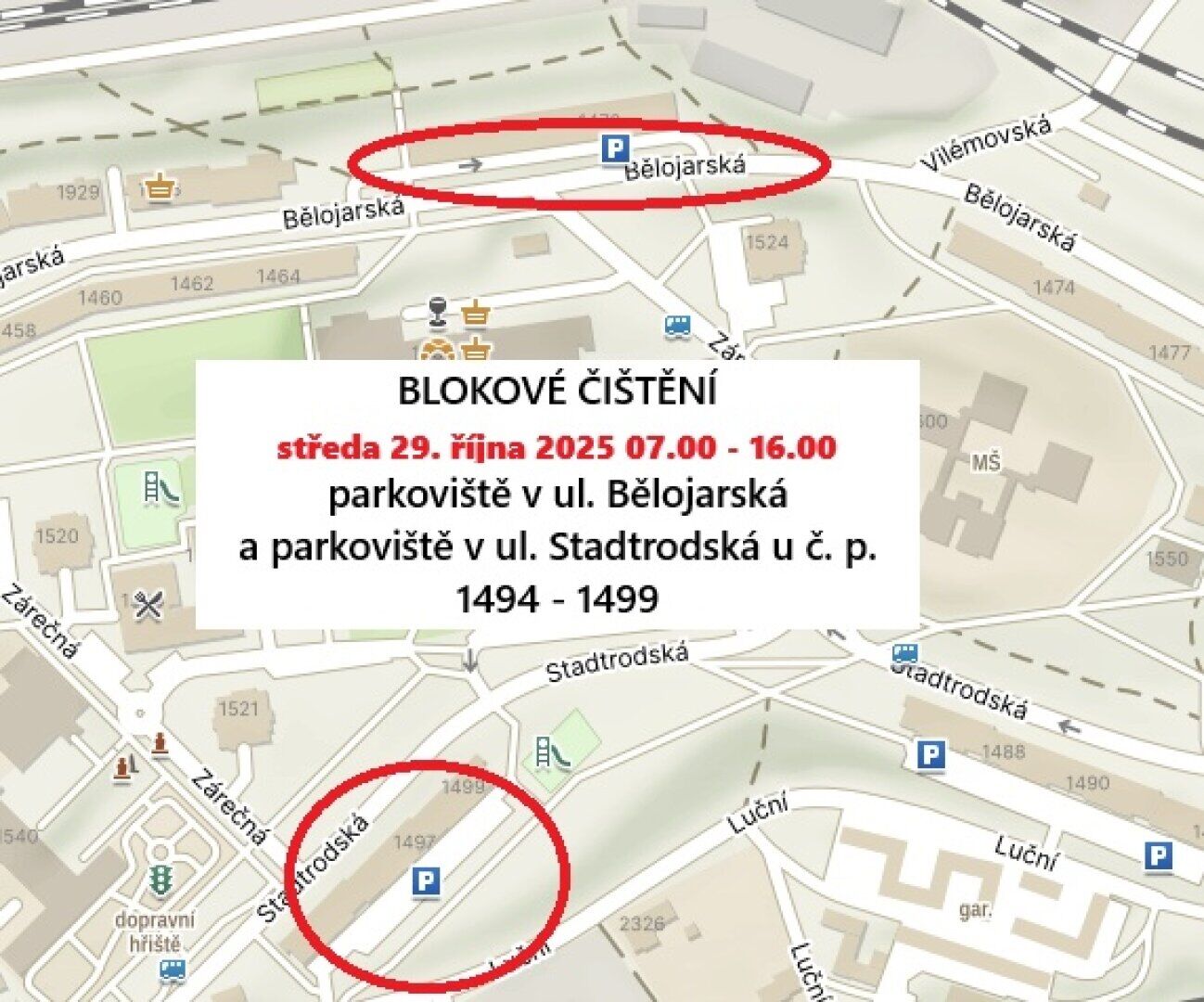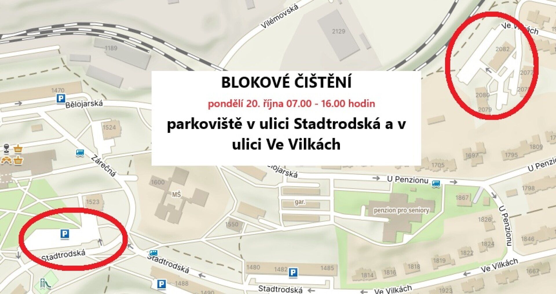 - Parkoviště v ulici Stadtrodská (pod věžákem č. p. 1523) a parkoviště v ulici Ve Vilkách