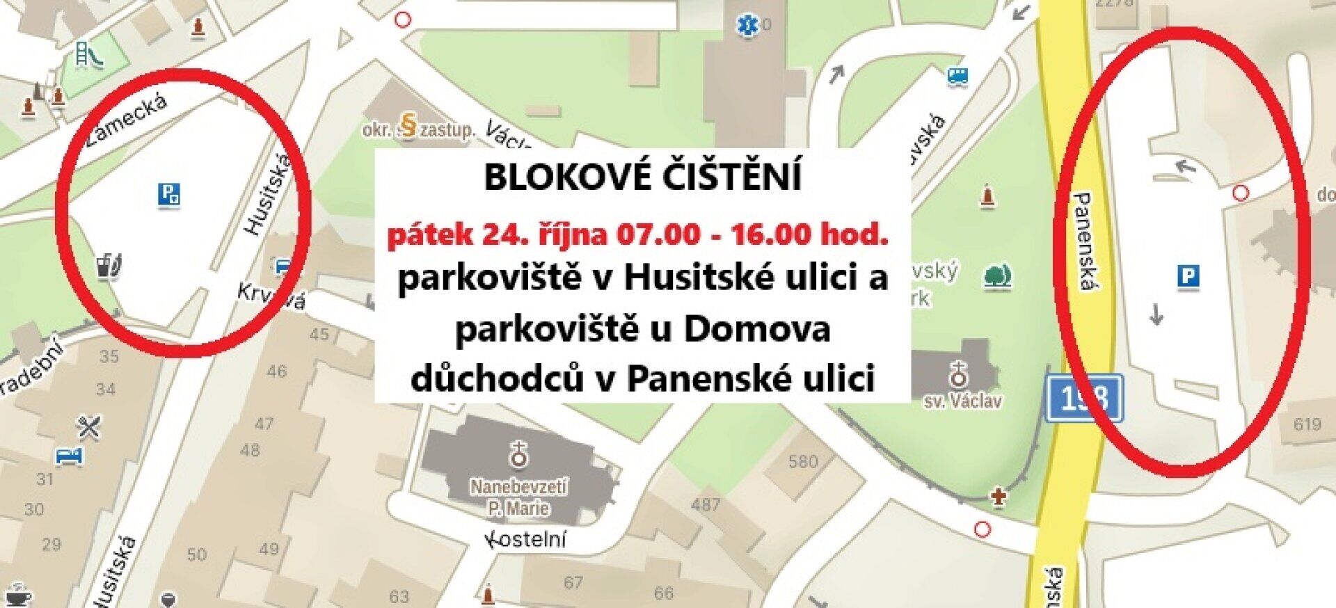 - Parkoviště v Panenské ulici (u domova důchodců) a parkoviště v Husitské