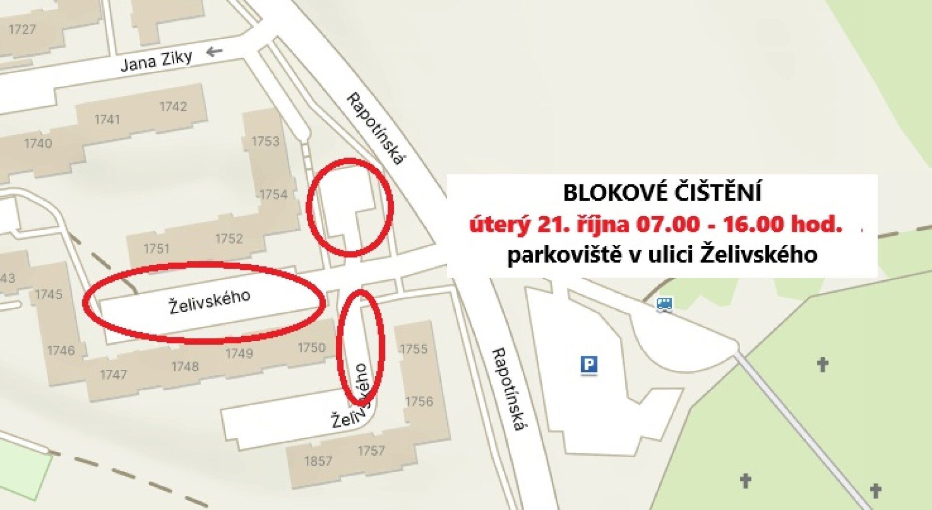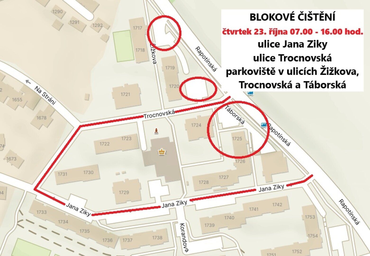 - Ulice a přilehlá parkoviště v ulici Jana Ziky, ulice Trocnovská, parkoviště v ulicích Žižkova, Táborská, Trocnovská.