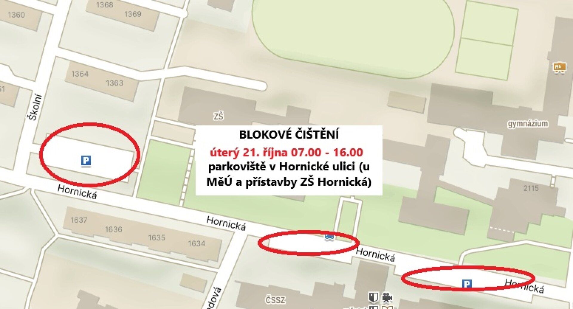- Parkoviště v ulici Hornická (u přístavby ZŠ Hornická a Městského úřadu)