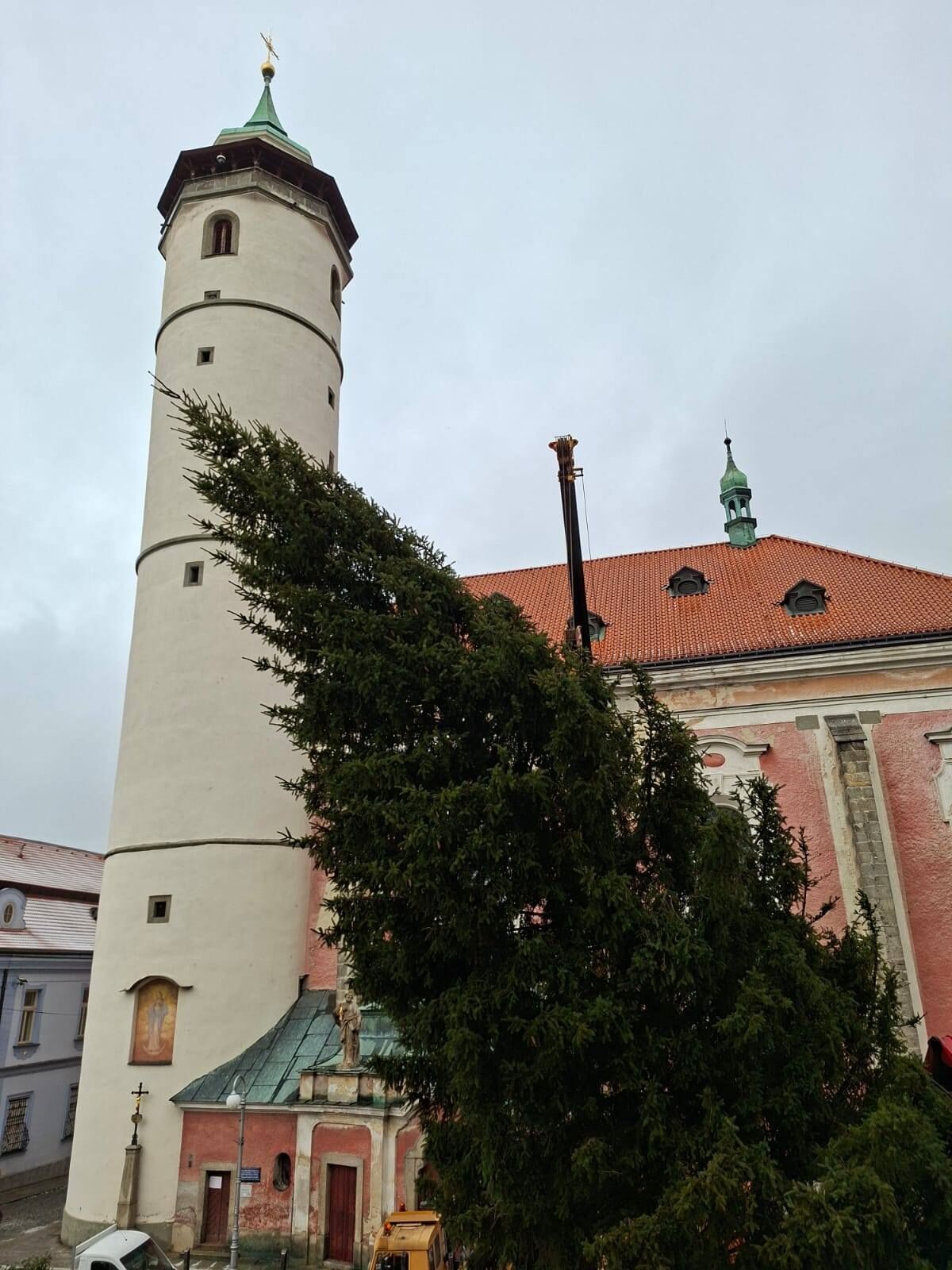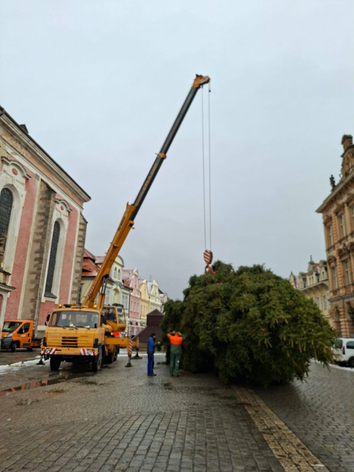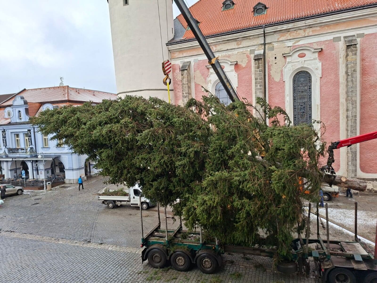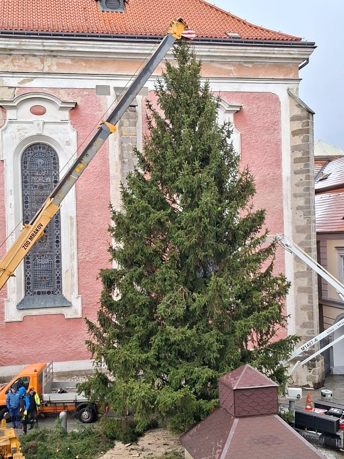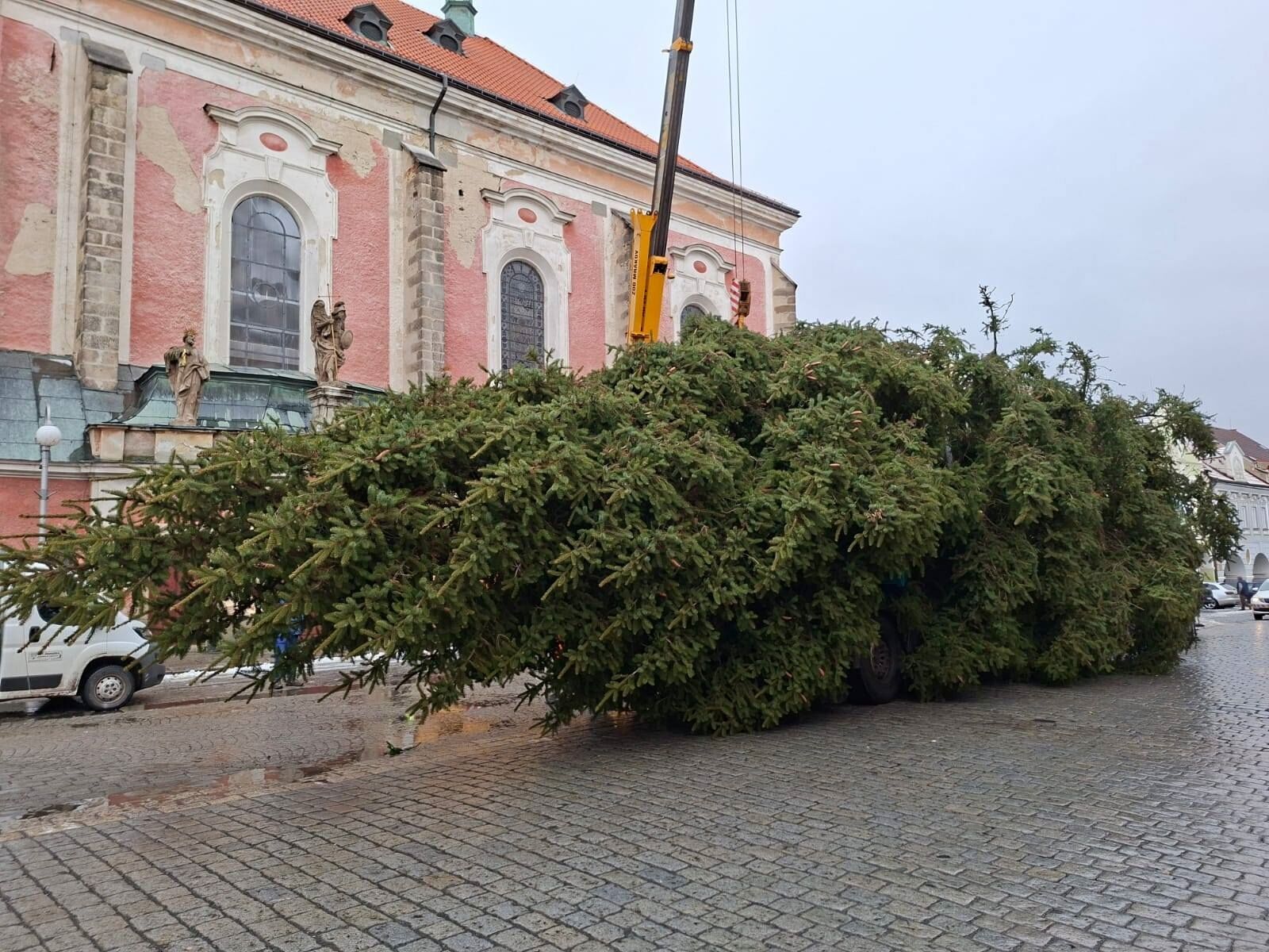 V pondělí 24. listopadu dopoledne instalovali pracovníci Domažlických technických služeb letošní vánoční strom na domažlické náměstí na tradičním místě u kašny.