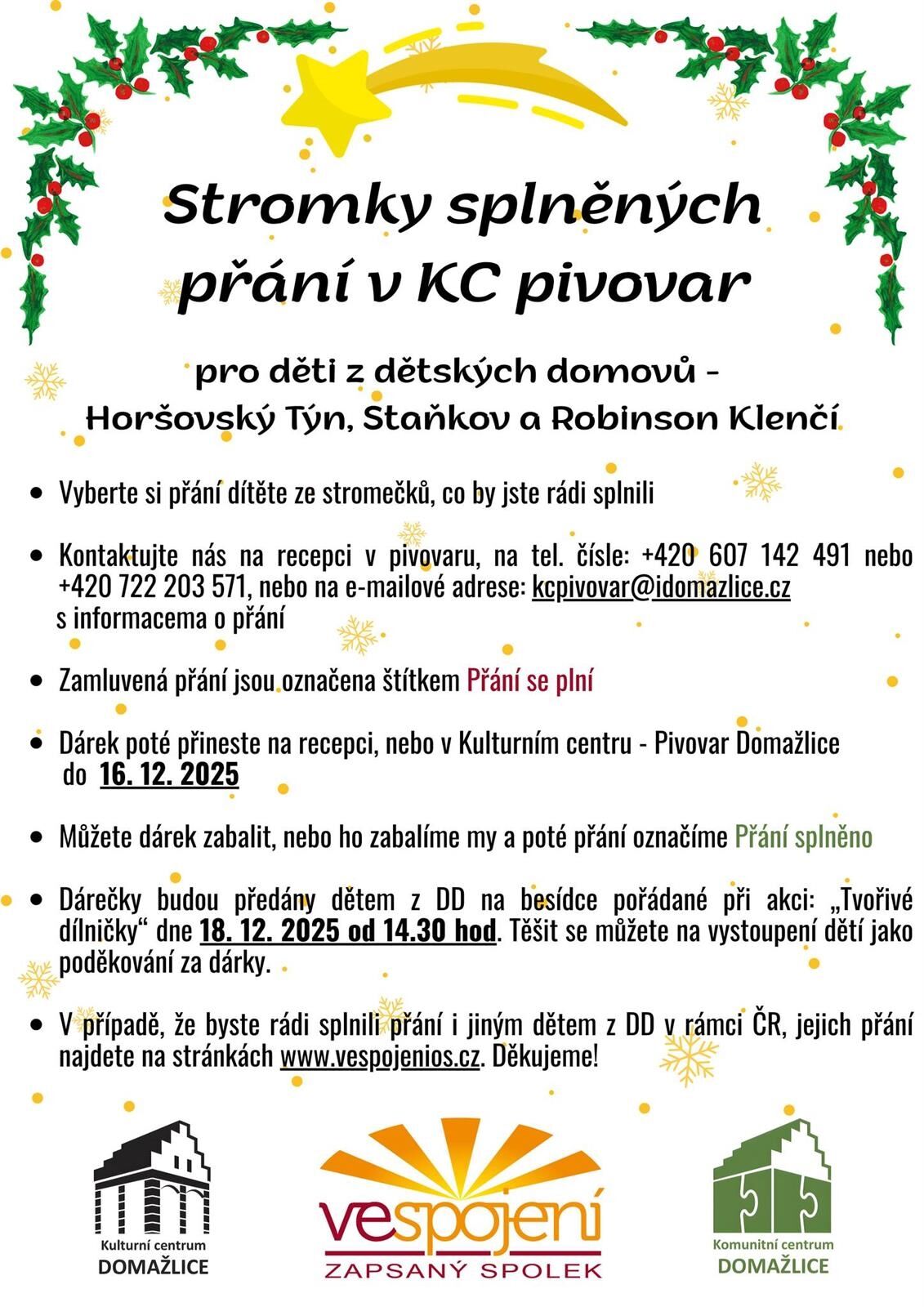 Vánoční stromky, které mají speciální poslaní najdete od úterý 18. listopadu v přízemí KC Pivovar na chodbě mezi recepcí, restaurací a komunitním centrem Pivovar Domažlice. Jedná se o 4 stromečky přání od dětí z dětských domovů Horšovský Týn, Staňkov a Robinson Klenčí pod Čerchovem.